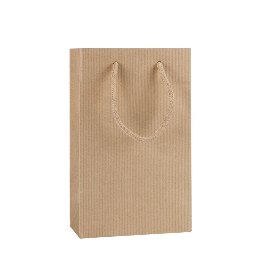 Elegantní přírodní dárková taška z pevného hnědého sulfátového (rýhovaného) papíru s kvalitními textilními šňůrkami. Taška působí moderně, minimalisticky a díky přírodnímu vzhledu je ideální pro ekologické balení dárků i firemní prezentace.