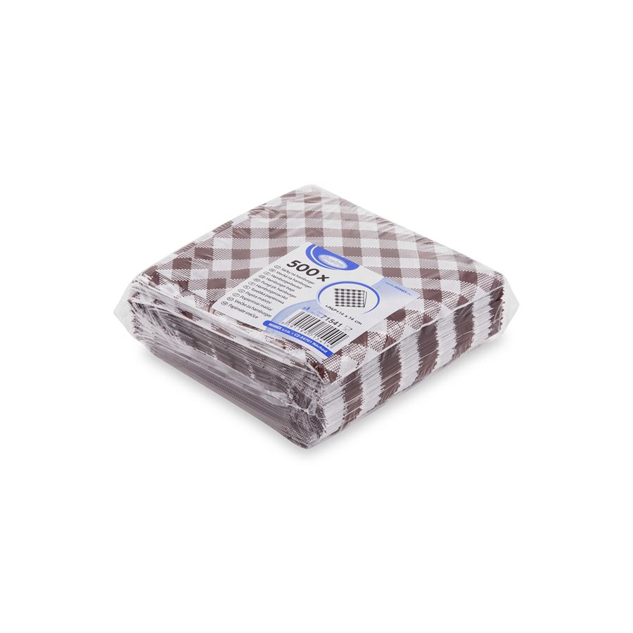 Balení 500 kusů papírových sáčků s designem KARO o rozměrech 14 x 14 cm. Perfektní pro hygienické a stylové balení hamburgerů a jiných jídel rychlého občerstvení.